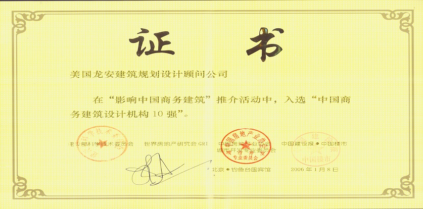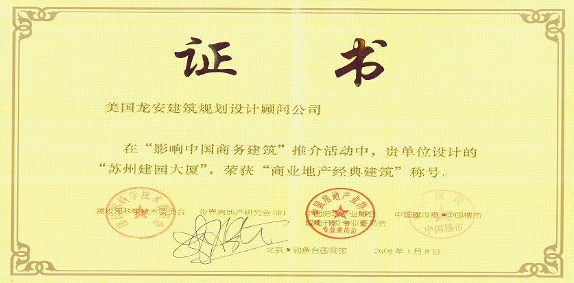 獲獎(jiǎng)情況:2006年,中國(guó)建設(shè)報(bào)中國(guó)樓市主辦“影響中國(guó)商務(wù)建筑”推介活動(dòng),榮獲“商業(yè)地產(chǎn)經(jīng)典建筑”稱號(hào);美國(guó)龍安公司榮獲“中國(guó)商務(wù)建筑設(shè)計(jì)機(jī)構(gòu)10強(qiáng)”,饒及人先生榮獲影響中國(guó)十大公建設(shè)計(jì)師稱號(hào)。